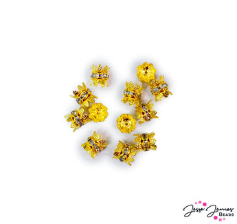 The perfect spacers for all your beads. These bright gold metal beads are decorated with an elegant pattern and crystal rhinestones. 12 pieces per set. Each piece measures 10.4mm X 7mm.
