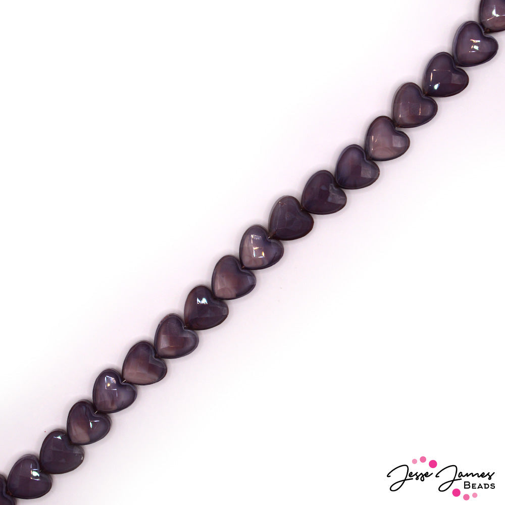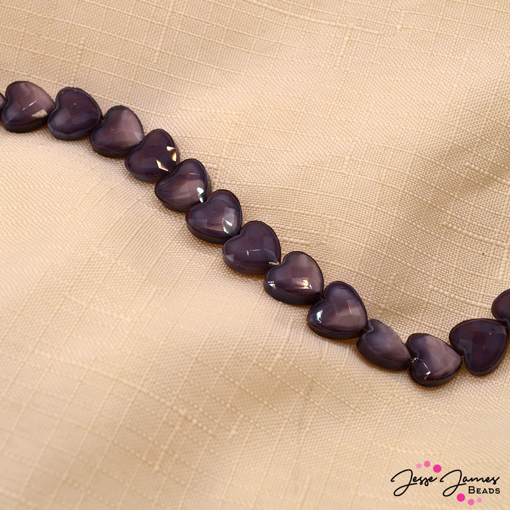 This single-style bead strand features faceted glass heart shaped beads in a rich dark purple color. These beads are lightweight, perfect for earrings, bracelets and more. Hearts measure 12.5mm. Beads are sold in a set of 12 pieces. Beads may come on a strong or bagged!