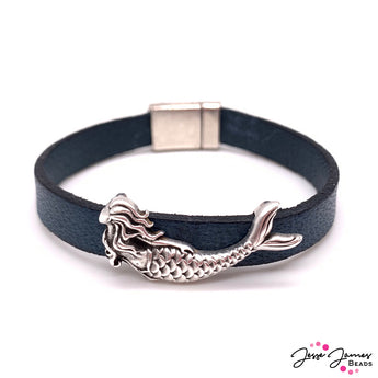 This sea-worthy bracelet features dark blue colored leather, mermaid slider, and scaled clasp. Each kit includes 8" of leather.