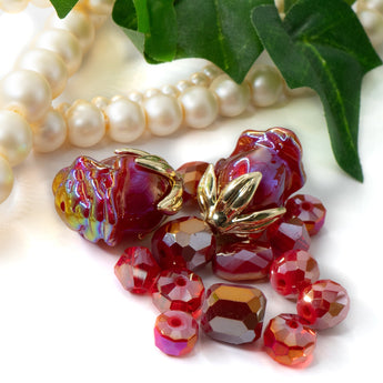 Paint the town read with this stunning rose-inspired bead mix. This show-stopper features beautiful acrylic rose beads with iridescent plating paired with faceted glass accents. Largest bead measures 23mm x 20mm x 5mm. Smallest bead measures approx 6mm x 2mm.