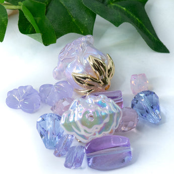 Escape to a creative getaway with this playful light purple rose bead mix. This stunning purple bead mix features beautiful acrylic rose beads with iridescent plating paired with faceted glass accents. Largest bead measures 23mm x 20mm x 5mm. Smallest bead measures approx 8mm.
