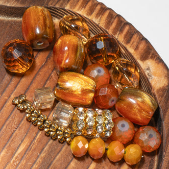 Dive into warm brown color with this dynamic burnt umber inspired bead mix. Each mix features four stunning resin immitation stone beads, perfect for adding the stunning sparkle of gemstones without adding the weight! These stunning beads are accompanied by faceted glass, gold metal spacers, and rhinestone spacers. Making them perfect for earrings or lightweight jewelry. Largest piece in mix measures 14mm x 12mm. Smallest piece in mix is 8mm x 2mm.