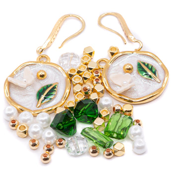 The mountain air is calling, and I must go… nature gals that love a bit of glam are going to go gaga for this earring kit. Our charm duo features enameled leaves and butterflies that rest peacefully in a pool of delicately swirled, pearl white resin, and the coordinating bead set has ultra faceted green glass beads, glass pearls, and metals. Bring these beauties all together with the unique drop-style earring findings. Because outdoorsy girls can go glitz, too. Each mix includes enamel and metal charms, faceted glass, mini glass pearls, and more. Largest piece measures 23mm x 20mm x 5mm. Smallest piece measures 5mm.