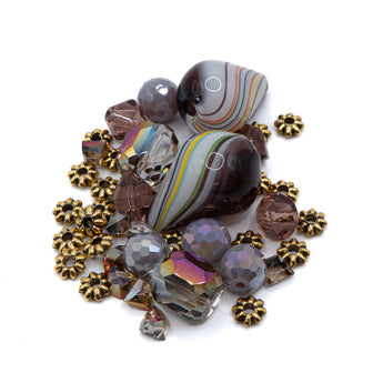 Moonlit strolls on the bead never looked this good! Each bead mix features beautiful hand-blown focal beads paired with faceted glass, and antique gold metal spacers. Largest bead in mix measures 20mm x 15mm. Smallest bead measures 4mm x 2mm.