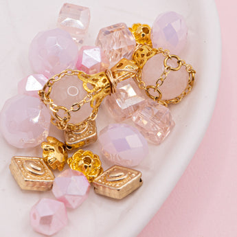 Lead with love and channel that good vibrational ALL HEART energy! Rose quartz crystals are suspended in golden chain to give you a gorgeous duet of charming, natural crystal beauty. This jewelry making kit comes together with more heart chakra pinks and the warming tones of gold - including 4 gorgeous golden lotus flower spacers! Available for just a limited time! Largest bead in mix measures 20mm x 10mm. Smallest bead measures 6mm.