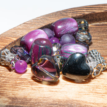 Bring out your passion for purple with this alluring bead mix. Each mix features four stunning resin immitation stone beads, perfect for adding the stunning sparkle of gemstones without adding the weight! Making them perfect for earrings or lightweight jewelry. These focal beads are accompanied by faceted glass, glass hearts, AB finished glass barrels, frosted glass rounds, silver metal spacers, and silver metal beads. Largest piece in mix measures 14mm x 12mm.