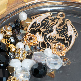 This elegant bead mix features luxurious gold and black hues. Each mix features a focal alloy enamel dragon charm paired with beady treasure fit for your bead horde. Each mix features faceted crystal glass, mini glass pearls, gold rhinestone beads, black faceted glass coins, and gold metal beads. Largest piece in mix measures 28mm x 26mm x 1mm. The smallest piece measures 4mm.