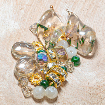 Create sparkling garden-party ready jewelry with this blend of crystal and gold floral beads. Each mix includes mini faceted glass shapes, faceted glass rondelle beads, faceted glass oval beads, faceted glass wide spacers, gold-plated metal spacers, gold-plated metal rhinestone beads, and 2 focal dried flower pendants encased in resin. Largest piece in mix measures 27mm x 15mm x 7mm. Smallest bead in mix measures 4mm x 2mm.