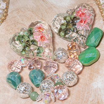 This adorable pale pink and minty green bead mix features a blend of rondelle glass beads, faceted glass spacer beads, flat faceted glass shapes, silver-plated round beads, mini round glass beads, silver-plated spacer beads, and two focal dried flower pendants. Largest piece in mix measures 25mm x 25mm x 11mm. Smallest bead in mix measures 4mm x 2mm.