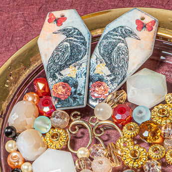 Adorn your next jewelry creation with a friendly familiar. This elegant blend of rustic red, pale orange, and touches of gold features bold pendants with a stunning crow image. Each mix features a blend of faceted glass, mini glass pearls, and bright gold-plated bead spacers. Each mix also includes a pair of ear wires for easy earrings! Largest piece in mix measures 40mm x 20mm x 2mm. Smallest bead in mix measures 4mm.