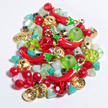 Spice up your jewelry game with this chili pepper-inspired bead mix, featuring alloy enamel hot pepper charms, faceted glass in teal, green, and fiery red, plus gold-plated bead spacers and caps. Create bold, sizzling designs that bring the heat! Largest piece measures 16mm x 10.5mm x 4.5mm. Smallest bead measures 4mm. Hole sizes range from 1mm to 2mm.