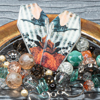This elegant twist on the classic Bat motif is the perfect way to create elegant Halloween or Autumnal themed jewelry. Each mix includes a blend of classic orange and black with a splash of teal. Included in each mix is a blend of faceted glass beads, two elegant batt themed pendants, glass pearls, and gunmetal rhinestone spacers. Each mix also includes a pair of ear wires for easy earrings! Largest piece in mix measures 40mm x 20mm x 2mm. Smallest bead in mix measures 4mm.