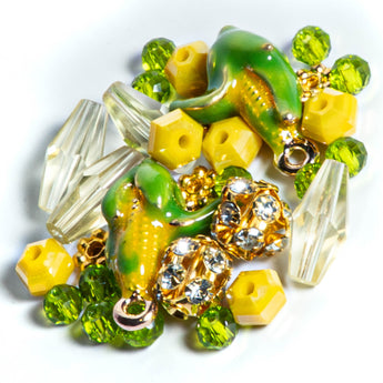 Bring a playful harvest vibe to your designs with this corn fruit-themed bead mix, featuring charming 3D Alloy corn charms, bright green faceted glass, vibrant yellow faceted glass, and a striking transparent yellow focal faceted glass. Gold-plated metal spacers, rhinestone metal beads, and large hole gold metal heishi spacers complete this sunny mix, perfect for crafting jewelry that celebrates the bounty of nature. Largest piece measures 19.5mm x 13mm x 9mm. Smallest piece measures 6mm x 2mm. Bead hole sizes range from 1mm to 3mm.