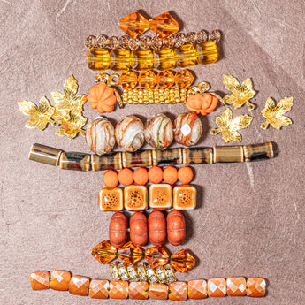 Add the whimsy of a trip to the pumpkin patch to your next jewelry creation. Each mix includes over 90 beads and bead spacers perfect for creating stunning earrings, bracelets, and necklaces themed for the Fall season. Each mini bead mix features a stunning blend of custon-dyed pumpkin shaped beads, orange ceramic cubes, faceted glass square beads, faceted glass bicones, gold and rhinestone bead spacers, opaque orange faceted glass beads, ceramic beads, marbled faceted glass beads, gold-plated metal spacers, mini faceted glass rondelles, mini glass cubes, and gold-plated leaf charms. Largest piece in this bead mix measures 12mm x 10mm. Smallest piece measures 4mm x 2mm.