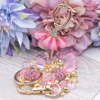 This adorable beaded keychain set features a metal alloy ballerina charm with stunning rhinestone accents. This dancer is accompanied by faceted glass, mini rhinestone boho beads, rhinestone spacers, bright gold metals, and matching gold keychain blank. Just add your favorite wire, thread, or cord to create an adorable keychain.