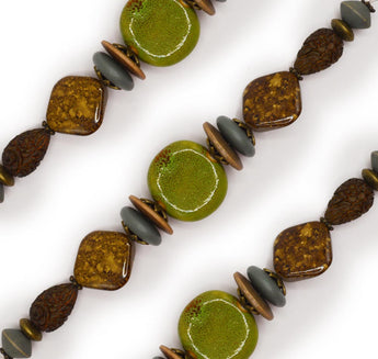 This beautiful nature-inspired bead strand features stunning rich greens and Earthy brown tones. 7 inch bead strand. Largest bead mesures 27.5mm x 30mm x 10mm. Smallest bead measures 12mm x 6mm.