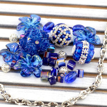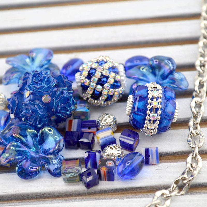 This rich dark blue bead mix features a blend of boho beads paired with millefiori glass, faceted glass, acrylic flowers, and an 18-inch cut of silver-plated brass chain. This bundle is the perfect jumping off point for jewelry creations. Each mix features a trio of clay boho beads with different adornments, giving you endless possibilities. Largest piece measures 20mm. Smallest piece measures 6mm.