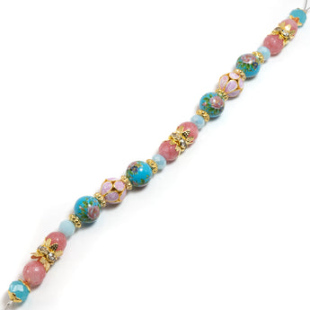 This playful pink and blue bead strand features stunning faux tensha beads, pink enamel metal beads, faceted glass, bright gold-plated metal spacers, and bright gold-plated metal bead caps.