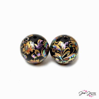 These 16mm opaque black Japanese Tensha bead layered with holographic magic and gold leaf detailing. This set of Japanese Tensha beads are crafted by hand using a delicate holographic decal set gently on a 16mm round opaque black acrylic ball. Each bead is then fully laquered with another acrylic coating to protect the beads from scratching and abrasion. Japanese Tensa beads have designs that are printed perfectly and fully covering each side of the bead. Each bead is made individually by hand. 2 beads per order.