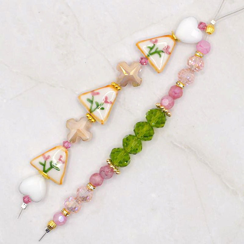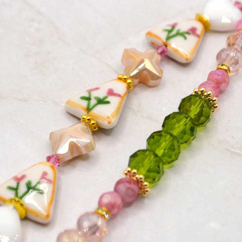 Add a romantic twist to your next jewelry project with this set of vintage pink and green beads. This duo of 4-inch bead strands features adorable floral printed vintage ceramic beads paired with faceted glass rondelles, faceted glass hearts, faceted glass rondelles, faceted glass crosses, mini glass bicones, and gold-plated metal spacers. Largest bead measures 16mm x 17mm x 6mm. Smallest piece measures 4mm x 2mm.