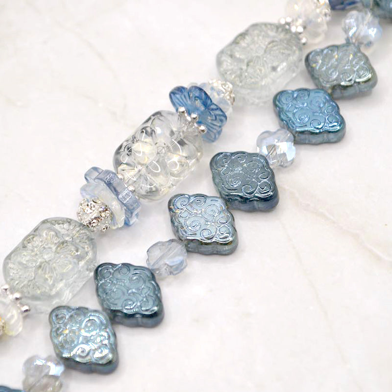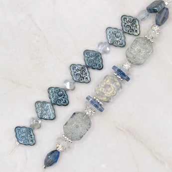 Add a snowy touch of magic to your next jewelry creation with this duo of 5-inch bead strands. Each strand includes beautiful pressed glass beads paired with mini faceted glass clovers, flat glass bead spacers, and silver-plated metal spacers. Largest bead in set measures 17.5mm x 13mm x 8mm. Smallest bead in set measures 8mm x 2mm.