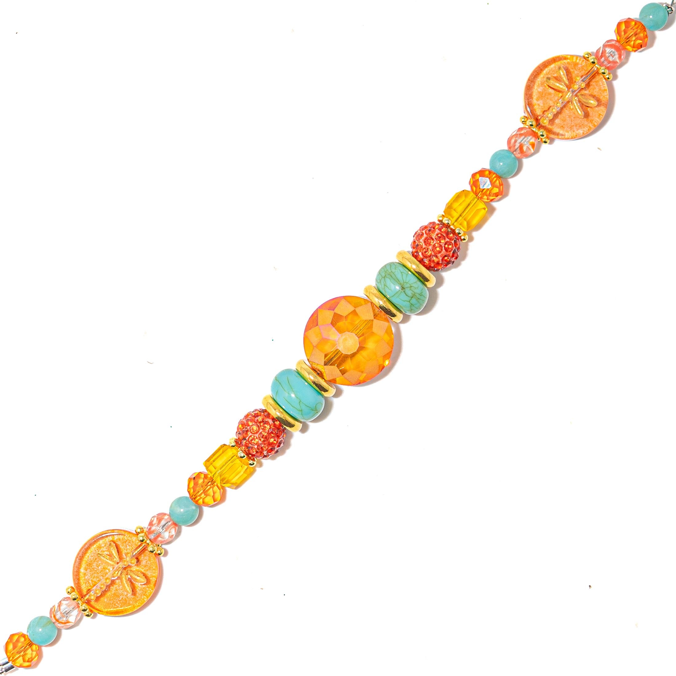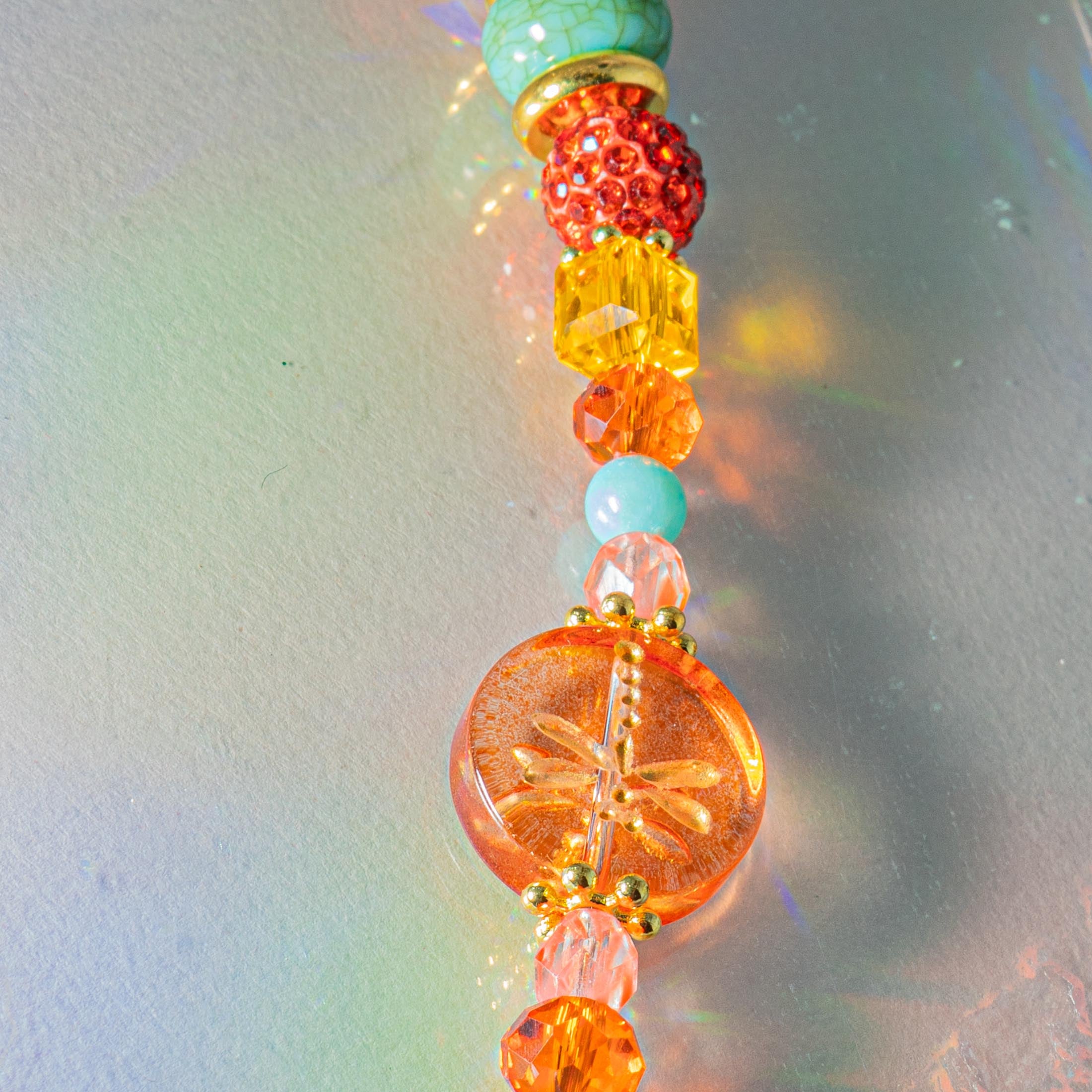 This bold and bright 7-inch bead strand features a blend of bright orange beads paired with teal and warm yellows. Each strand features pressed glass dragonfly beads paired with faceted glass rondelles, glass bicones, glass roundes, turquoise stone large hole beads, mini clay rhinestone boho beads, and bright gold-plated brass bead spacers. Each strand includes 30 pieces to work with. Largest bead measures 17mm x 17mm x 5.5mm. Smallest bead measures 6mm x 2mm.