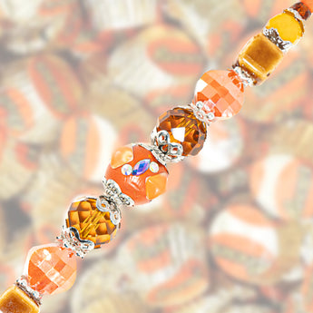 A trick-or-treating favorite. These mini 5-inch bead strands feature a blend of orange and yellow tones inspired by the classic peanut butter cup. Each strand includes a focal boho bead, faceted glass rondelles, ceramic cubes, faceted glass coin beads, and silver-plated metal bead spacers. The largest bead on the strand measures 16mm x 20mm. The smallest bead on the strand measures 6mm x 2mm.
