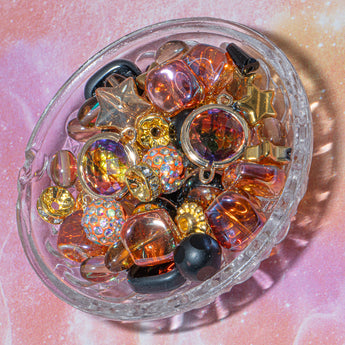 Dive into a bold and bright splash of cosmic color with this space-themed bead mix. Each mix features mini glass star beads, glass star-shaped beads, organic rectangular smooth glass beads, lampwork orange and black beads, bright gold-plated bead spacers, AB orange connectors, AB orange mini glass beads, and black glass round and rectangular beads. Largest piece in the mix measures 12mm. Smallest bead in mix measures 8mm.