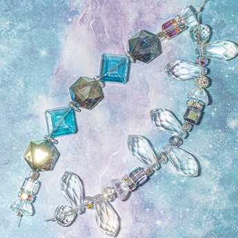 Add intense sparkle to your next project with this duo of 5-inch bead strands. Each strand features an array of stunning AB crystal glass beads, including AB faceted glass teardrop pendants, faceted glass cubes, faceted glass floral beads, AB faceted glass hexagons, teal flat faceted squares, silver-plated metal bead spacers, and silver-plated metal rhinestone bead spacers. The largest piece on the strand measures 20mm x 10mm. The smallest bead on the strand measures 3mm.
