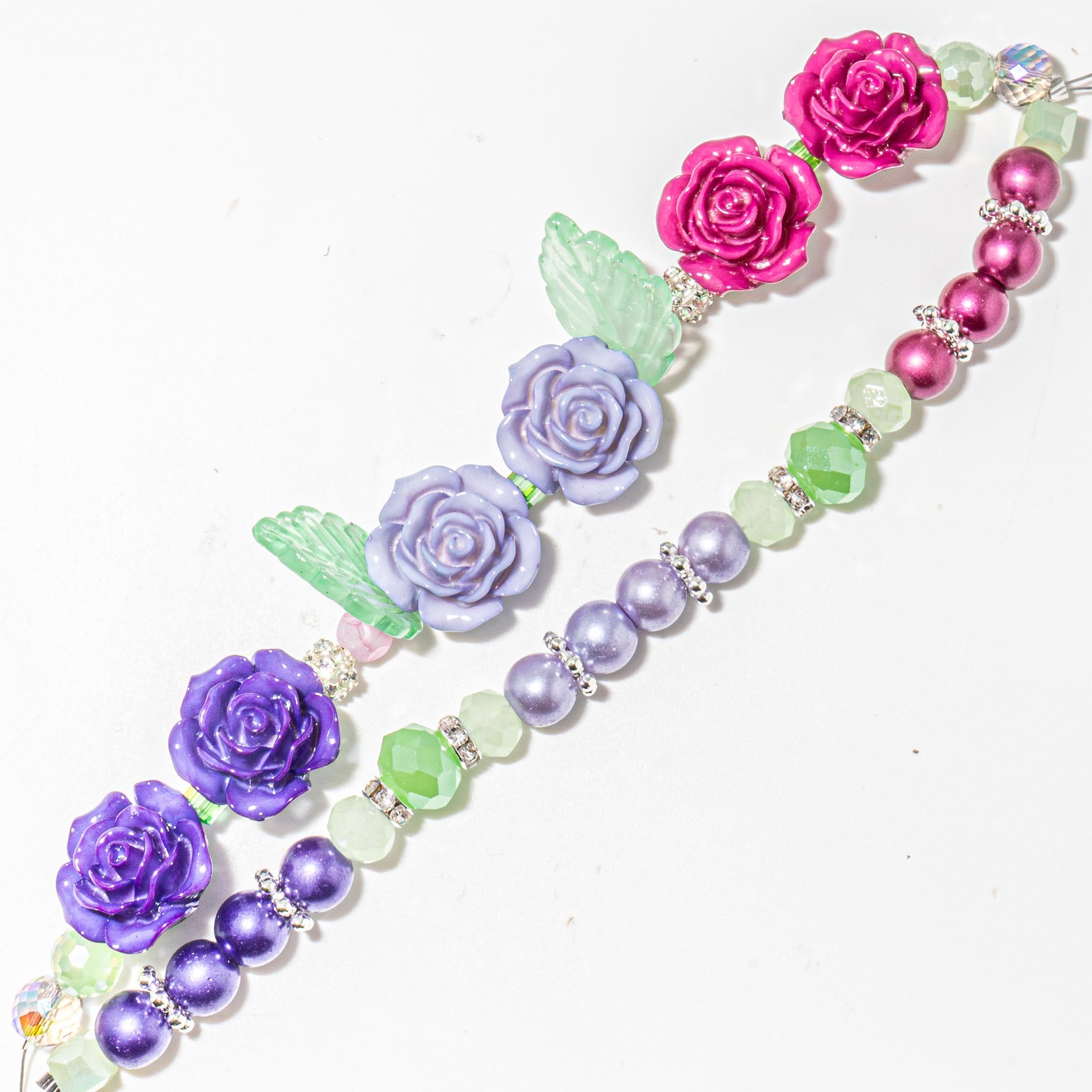 This playful blend of deep red and purple beads adds a romantic touch to your next bead project. Each 6-inch bead strand features custom dyed glass pearls, custom-dyed acrylic roses, acrylic leaf beads, gold-plated daisy spacers, silver-plated daisy spacers, rhinestone spacers, and faceted glass teardrops. Largest piece in set measures 18mm x 16mm x 10mm. Smallest piece measures 4mm.