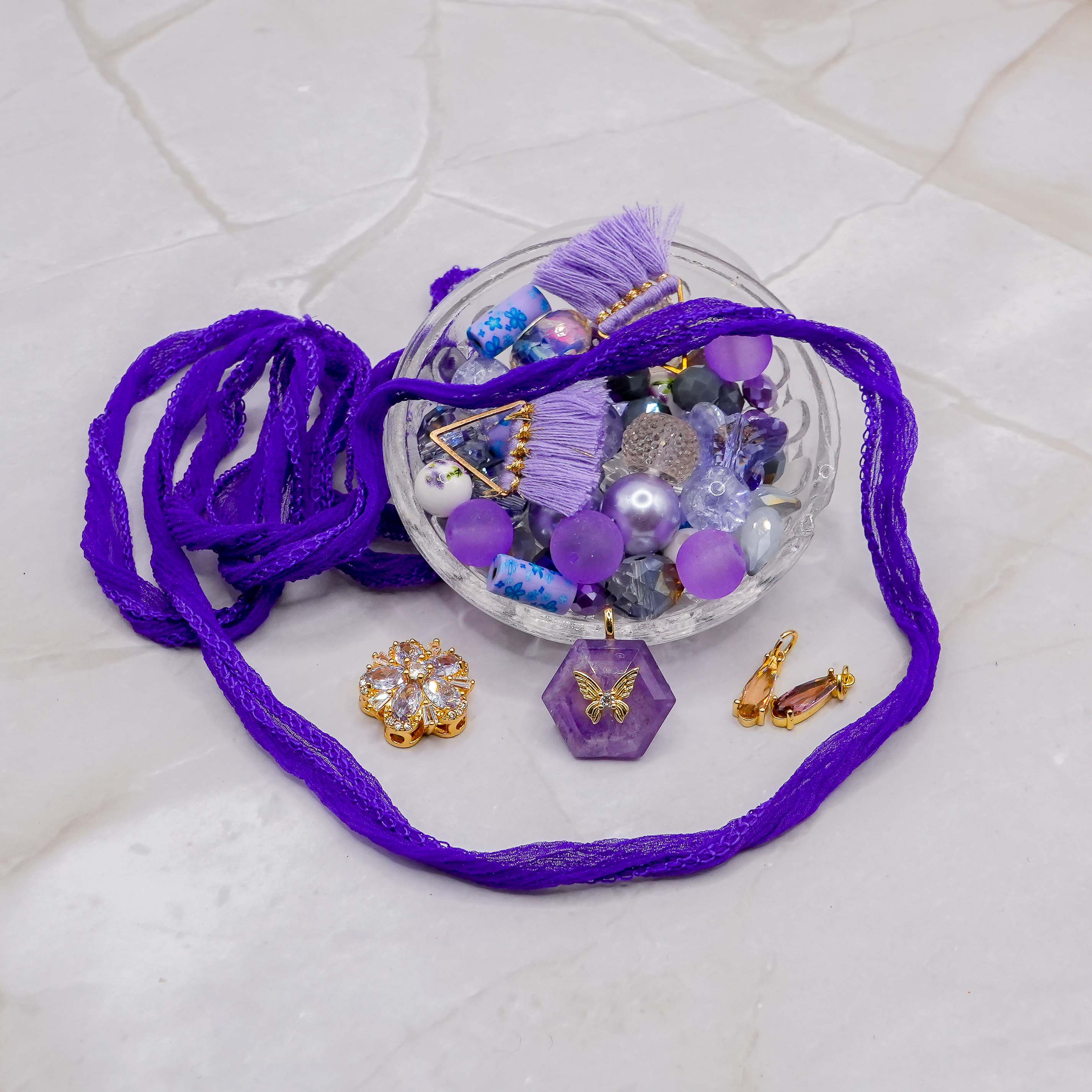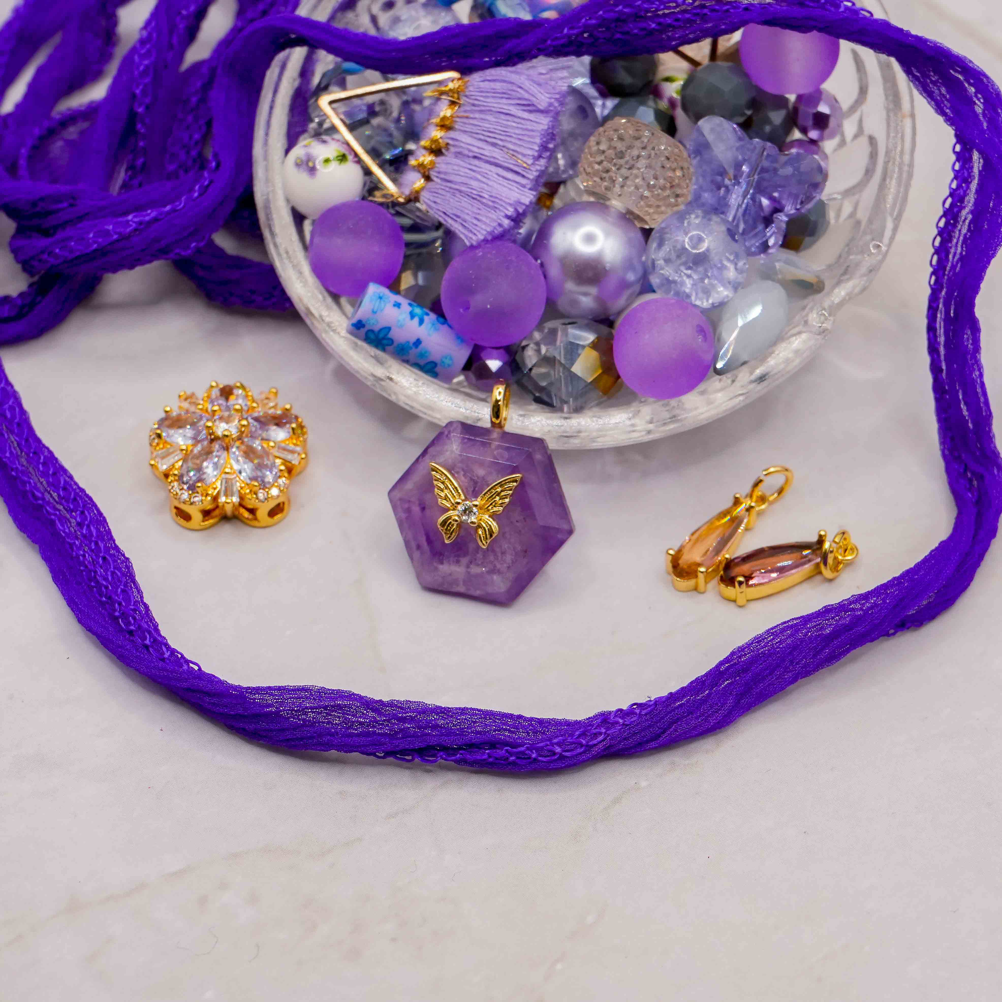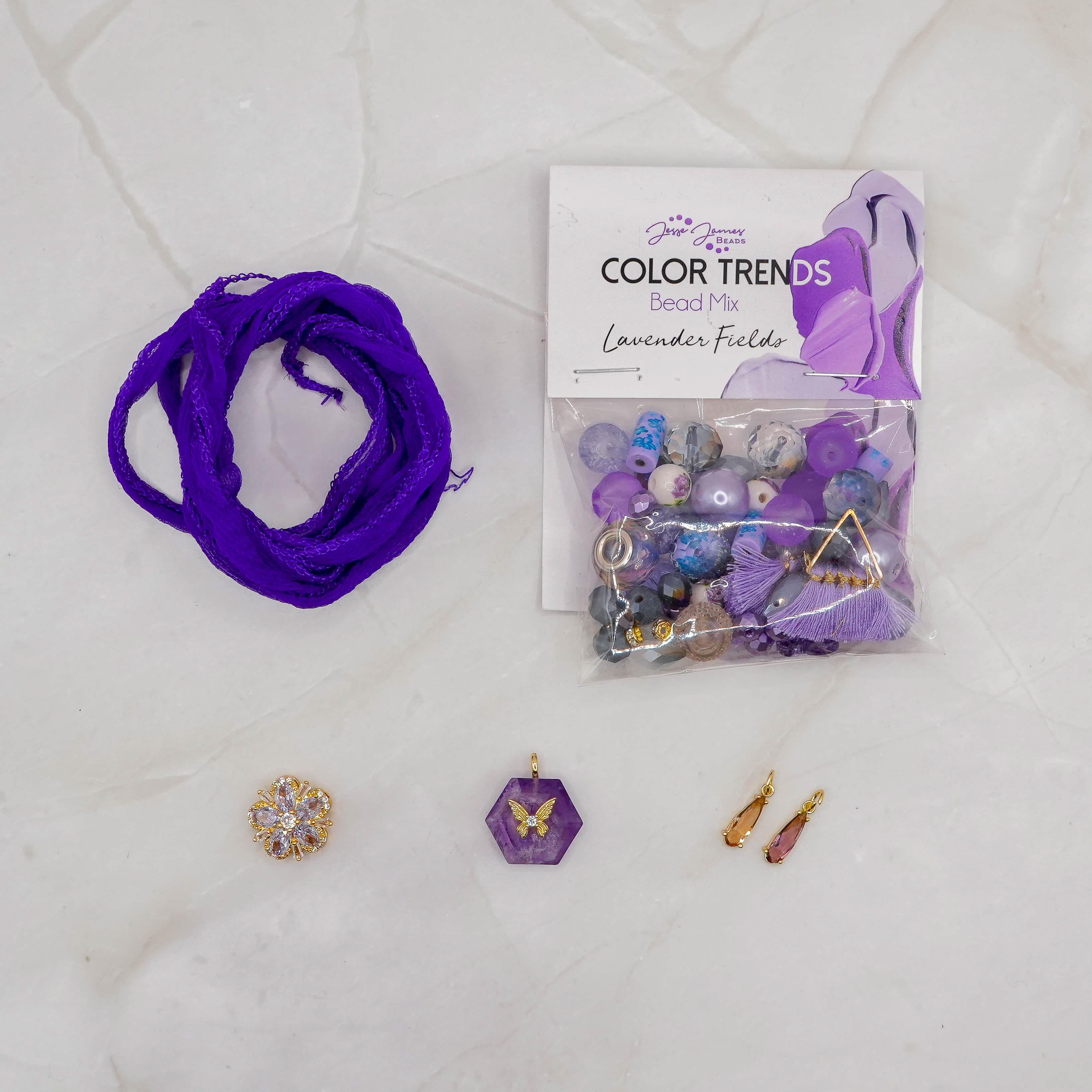 This stunning bundle of beads features a charm set featuring a natural Amethyst stone charm, Swarovski Crystal flower charm, and glass teardrop charms. These charms are paired with a Color Trends Bead Mix in Lavender Fields, and a custom dyed length of Fairy Silk in stunning Amethyst purple.