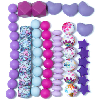 Explore the cosmos with the Purple Galaxy Silicone Bead Mix! This stellar collection includes heart and star-shaped silicone beads, solid color rounds, printed geometric beads, and playful bubble disks—all in cosmic purples and deep hues, perfect for out-of-this-world keychains, teething toys, and dreamy DIY creations. 40 pieces. 2mm bead holes.