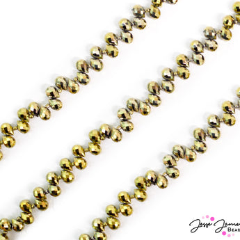 Add grand jewelry accents to any piece with these faceted top-drilled teardrop-shaped glass beads. These beads feature a rich metallic gold color, perfect for pairing with any of our Renaissance-inspired bead strands or mixes. Each bead measures 11mm x 8mm. Each strand includes 95 beads per strand.