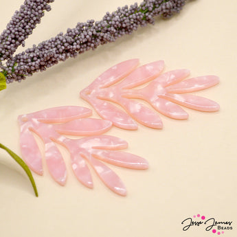 These floral fern acrylic pendants feature a light pink color! Ideal for earrings and necklaces, these lightweight beads feel as light as they look. Each pendant measures 48mm x 28mm x 2.4mm. Inner bail measures 1.5mm. Each set includes 2 pendants