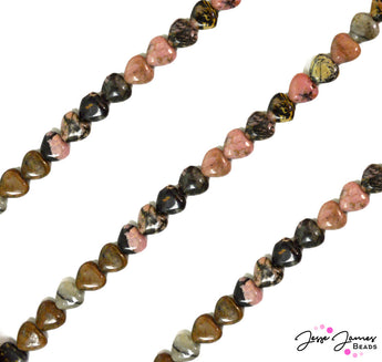 These wild rhodonite heart beads feature a blend of natural brown, peach, and creamy earth tones. Each bead is carved into a heart shape, perfect for bracelets, earrings, and more. Each piece measures 9mm x 11mm x 5mm. Each strand includes approx. 38 pieces.