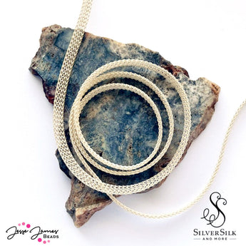 This bright antique white flat mesh is and stunning alternate to silver, perfect for wrapping on bracelets, creating bold necklaces, and more. This chain is durable, free-flowing and can be cut to any length without fraying. All Winter Workshop items start shipping November 16th, 2022.