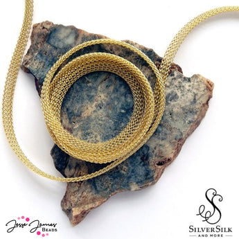 This bright gold flat mesh is delicate and lightweight, perfect for wrapping on bracelets, creating bold necklaces, and more. This chain is durable, free-flowing and can be cut to any length without fraying. All Winter Workshop items start shipping November 16th, 2022.