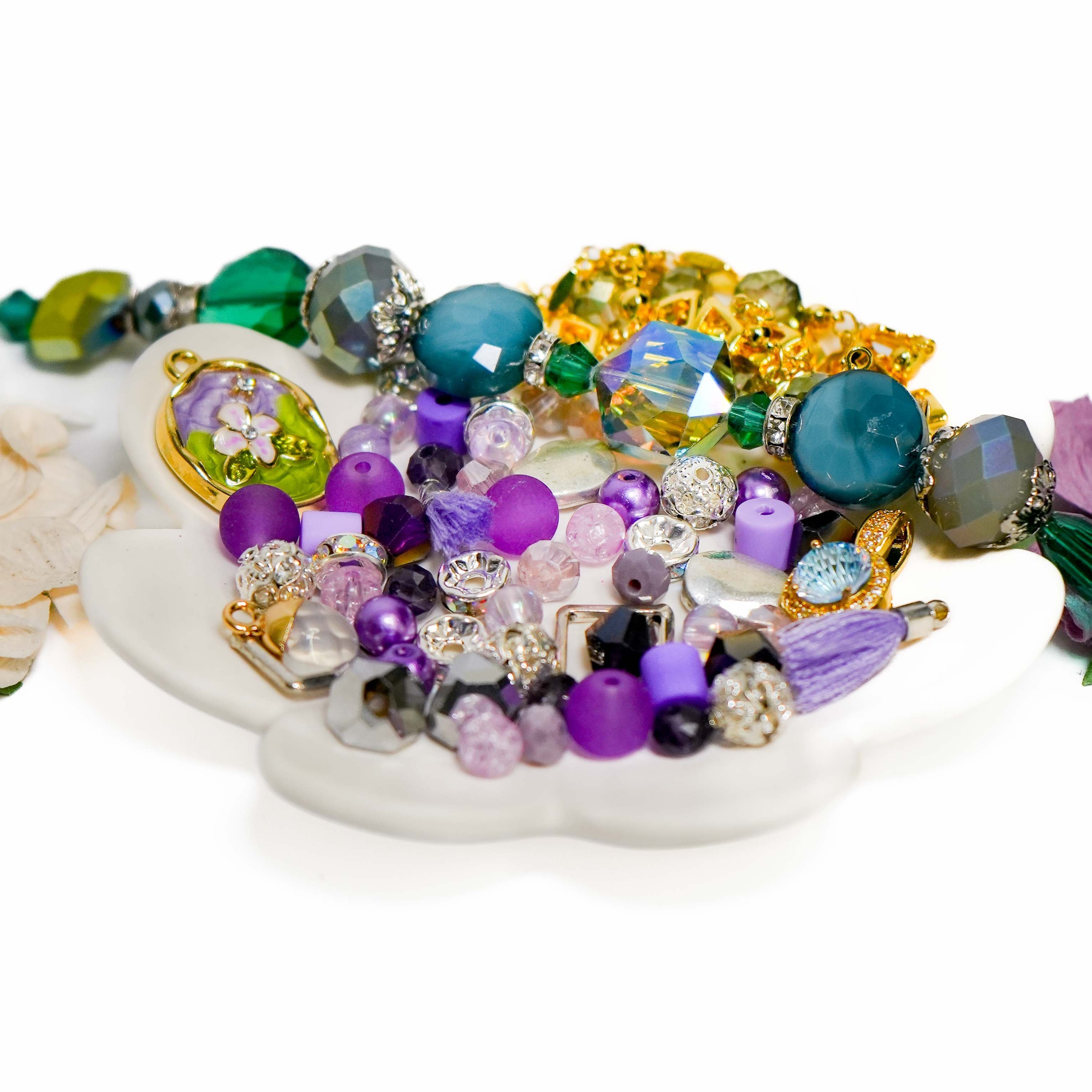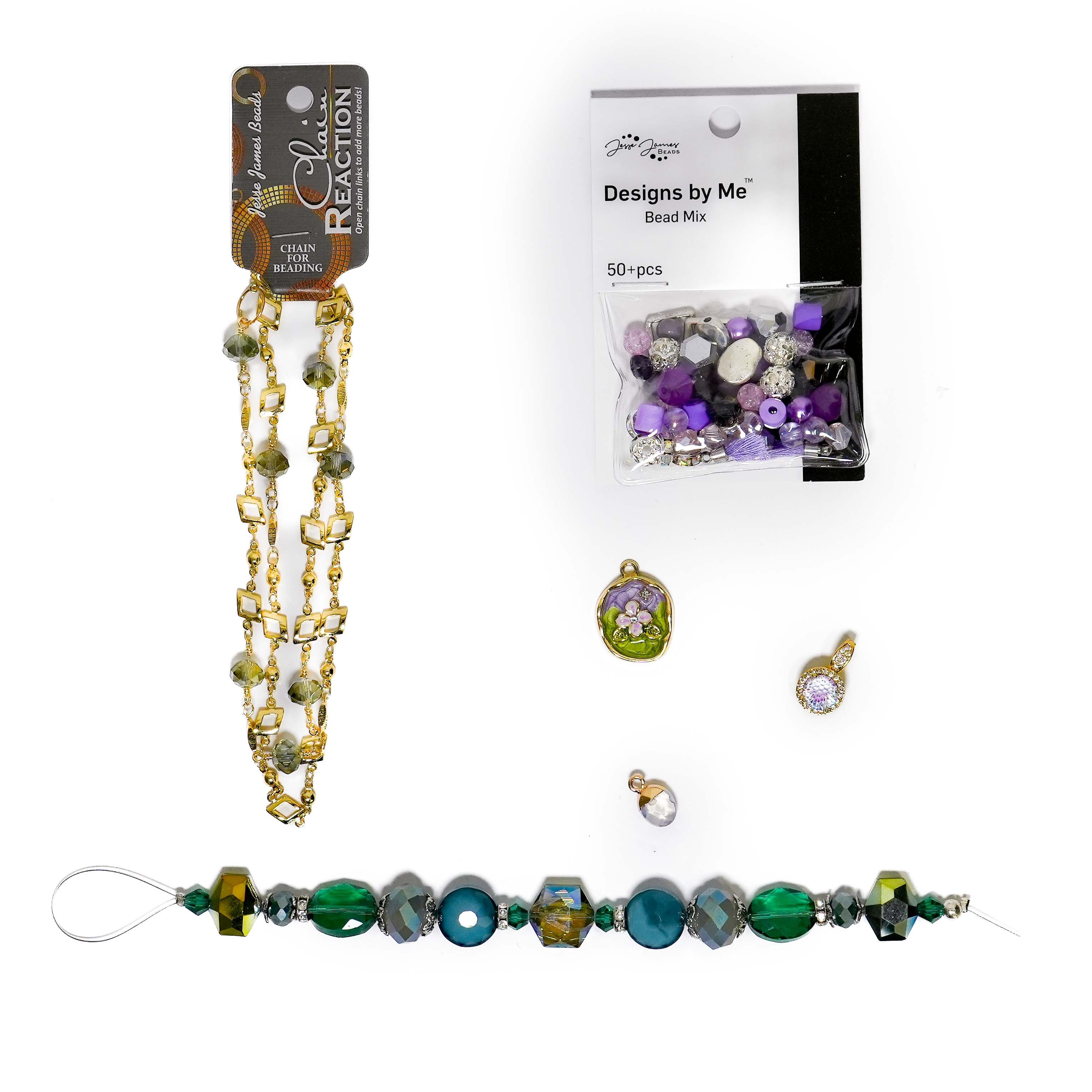 This bold blend of floral tones feature reach teal and pops of purple. Each bundle includes a set of charms, a mini bead mix in purple, a 7-inch bead strand in teal, and a gold and sage pre-clasped chain reaction chain.