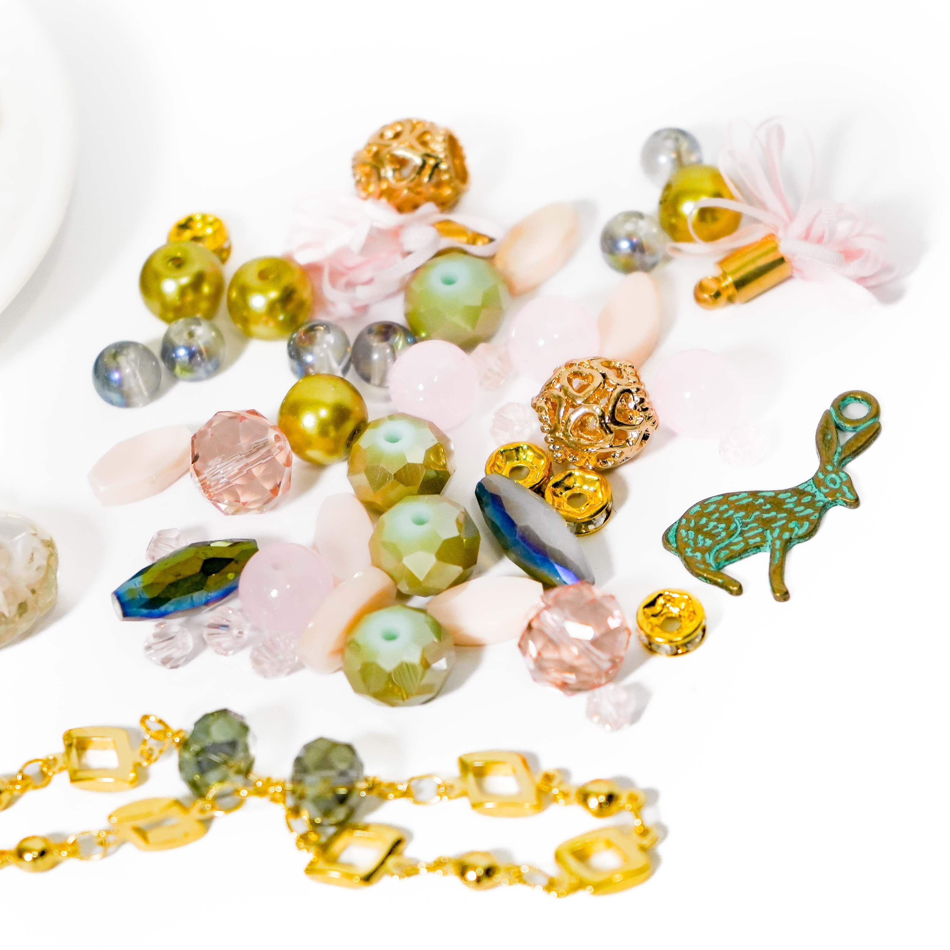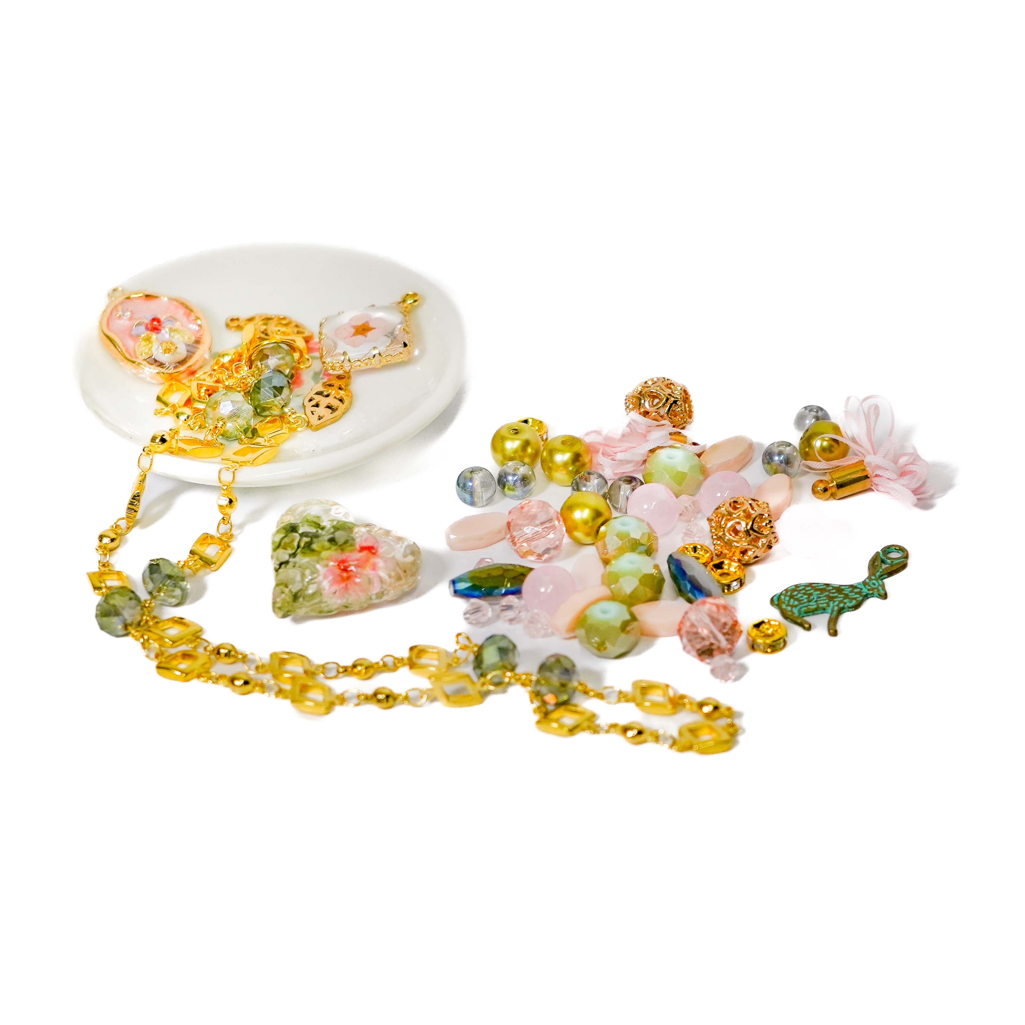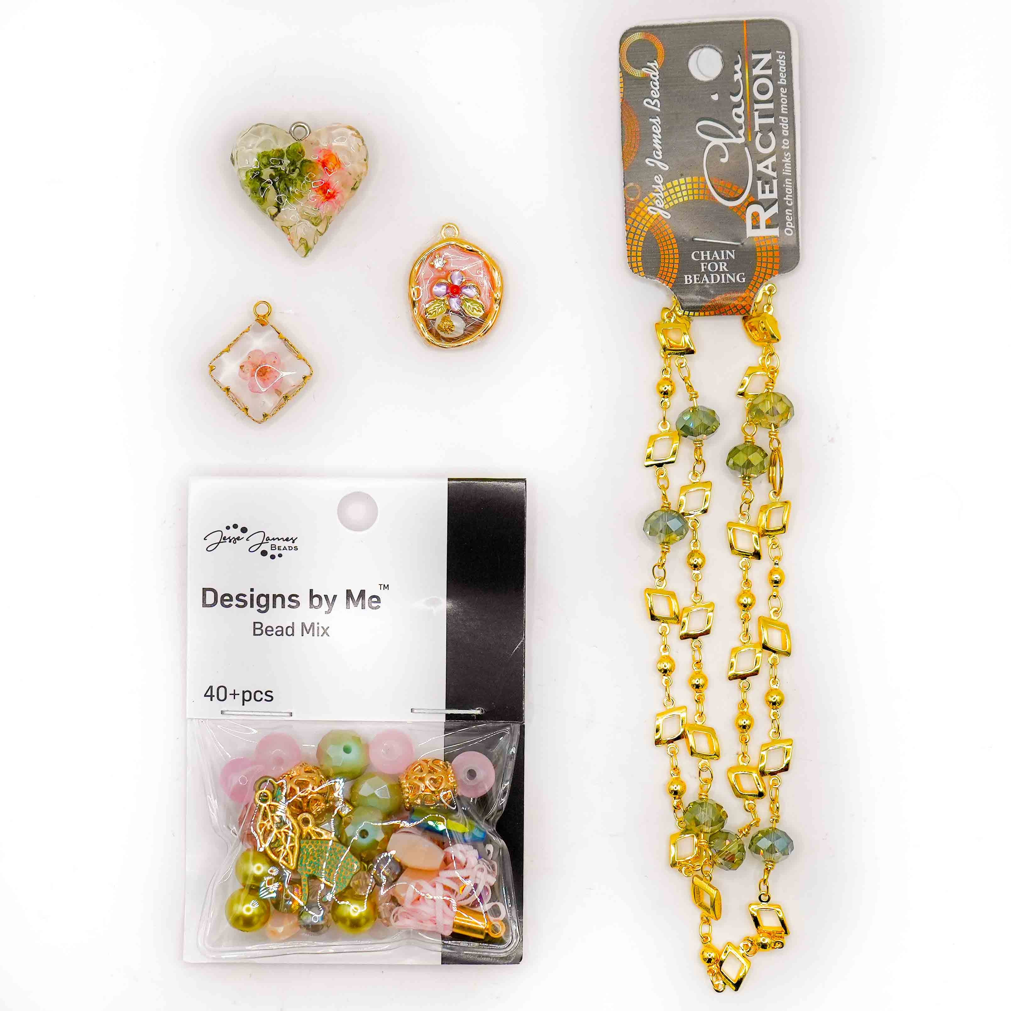 Add a little romance to your bead stash with this stunning bundle of charms, beads, and chain. Each bundle includes a trio of beautiful floral resin charms paired with a mini bead mix of matching pink and green tones, and a chain reaction beaded chain from Jesse James Beads.