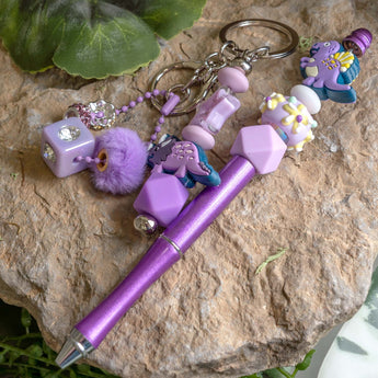 This playful project kit features adorable silicone Spinosaurus and Triceratops charms, a blend of lilac and purple beads, a silver keychain blank, glitter beaded pen blank in purple, and a ball keychain blank. Perfect for creating 3 stunning paleo-themed projects!