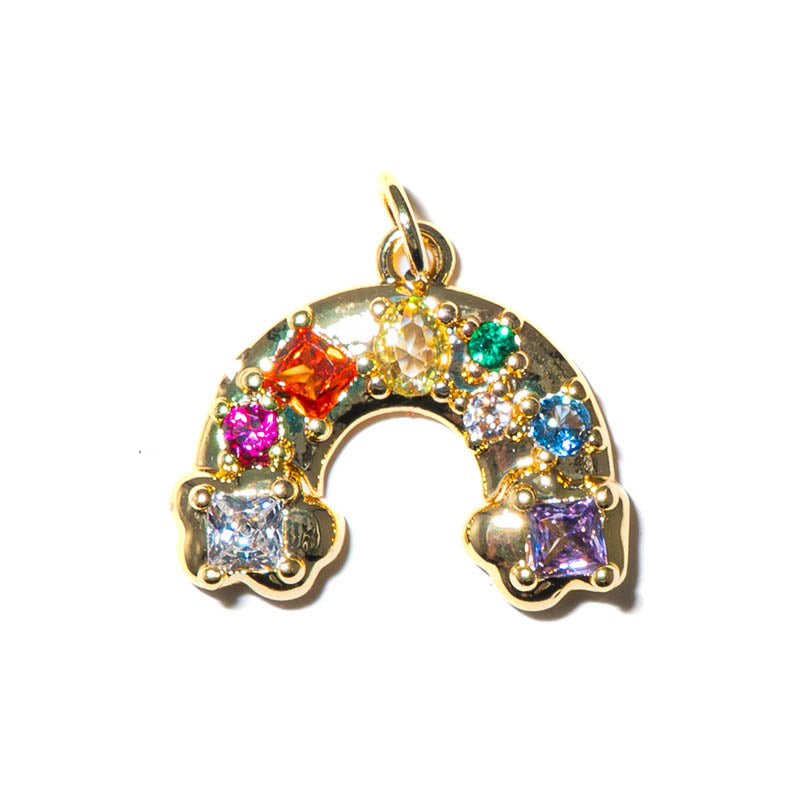 Bring vibrant brilliance to your jewelry designs with these Brass Micro Pave Cubic Zirconia Rainbow Pendants. Expertly crafted from durable brass, each charm is intricately micro-pavé set with dazzling cubic zirconia in a lively rainbow arrangement for maximum sparkle and color. Finished with high-quality rack plating and real 18K gold plating, these pendants offer a rich golden shine with long-lasting durability. Measuring 15.5x19x3.5mm with a 3.5mm hole, they are ideal for necklaces, bracelets, and statement pieces that need a bold yet refined touch. Cadmium free and lead free, these radiant rainbow charms combine premium craftsmanship, safety, and eye-catching elegance in every detail.