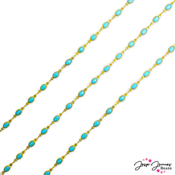 This delicate chain features a bold pop of turquoise color surrounded by antique gold brass metal. Each length of chain is pre-cut in 18 inch increments. Links measure 11.5mm x 3.5mm.