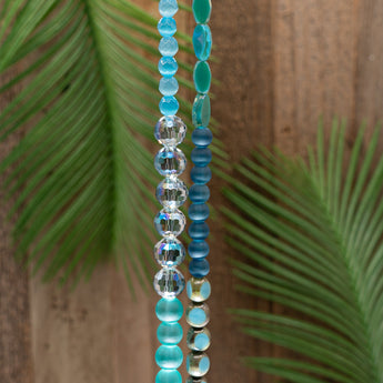 Dive into crystal teal color with this duo of 7-inch bead strands. Each strand features several styles of stunning glass beads, including faceted glass rondelles, round glass balls, galaxy faceted rounds, cats-eye finished faceted rounds, and more. The largest bead on the strand measures 20mm. The smallest bead on the strand measures 6mm. Perfect for creating bracelets, necklaces, or stocking up your bead stash with unique glass beads.