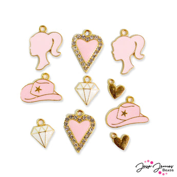 Start your own dreamhouse life with this bold pink and gold charms! This set of charms features hearts, diamonds, cowboy hats, and more all in a bold pink color! Largest piece in mix measures 21mm x 15mm x 2mm. Smallest piece in mix measures 14mm x 11mm x 2mm.