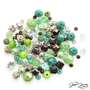 A fresh minty twist on ice cream, this bead mix features a mist of creamy mint colored beads paired with dark chocolate brown chocolate chip beads. Each mix features faceted glass, milky glass, faux lava beads, mint pearls, brust silver metal accents, AB spacer beads, and more. Largest bead in mix measures approx 14mm. Smallest bead in mix measures approx. 4mm.