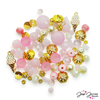 Classic sweet strawberry and cream come together in this creamy bead mix. This mix features pastel milky glass beads paired with faceted glass, bright gold metal spacers, mini rhinestone beads, mini rhinestone spacers, ice cream enamel charms, rondelle glass beads, and more. Largest bead in mix measures approx. 14mm. Smallest piece in mix measures approx. 2mm x 4mm.