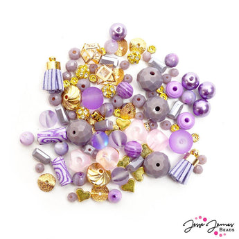 For those who want an exotic twist to their ice cream. This bead mix is inspired by taro root, also called Ube, flavored ice cream. This pastel purple blend features opaque glass, faceted glass, mini leather tassels, gold metal beads, mini rhinestone spacers, fimo beads, and more. Largest bead in mix measures approx. 14mm. Smallest bead in mix measures 3mm.