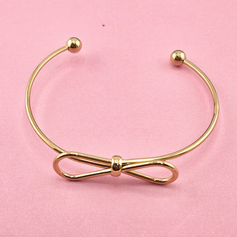 This adorable Bow bangle features a 304 Stainless Steel base adorned with a real 18K Gold plating. Waterproof and tarnish-resistant. Open Cuff Bangles Design, Real 18K Gold Plated, Inner Diameter: 2x 2-3/8 inch(5x6.15cm)