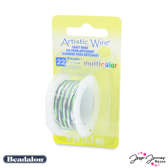Emerald bright green, elegant black, and sparkling silver come together in this 22 gauge ombre wire. Each spool contains 6 yards of wire. The Artistic Wire MultiColor wires incorporate a repeating pattern of 3 colors to create a beautiful ombré pattern. Use this effect to create beautiful groupings of color with herringbone or conventional wire wrapping. Also looks fantastic in coiled beaded beads.