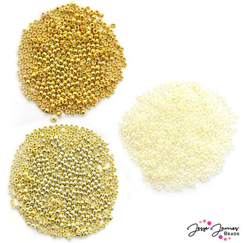 Add a little sparkle wherever you go with this blend of seed beads. Each pack includes 5 grams of dark gold, light gold, and pearlized white. 15 grams of seed beads total per pack, that's about 1500 seed beads! Each bead is Toho 11/0 size, about 2.1 mm.